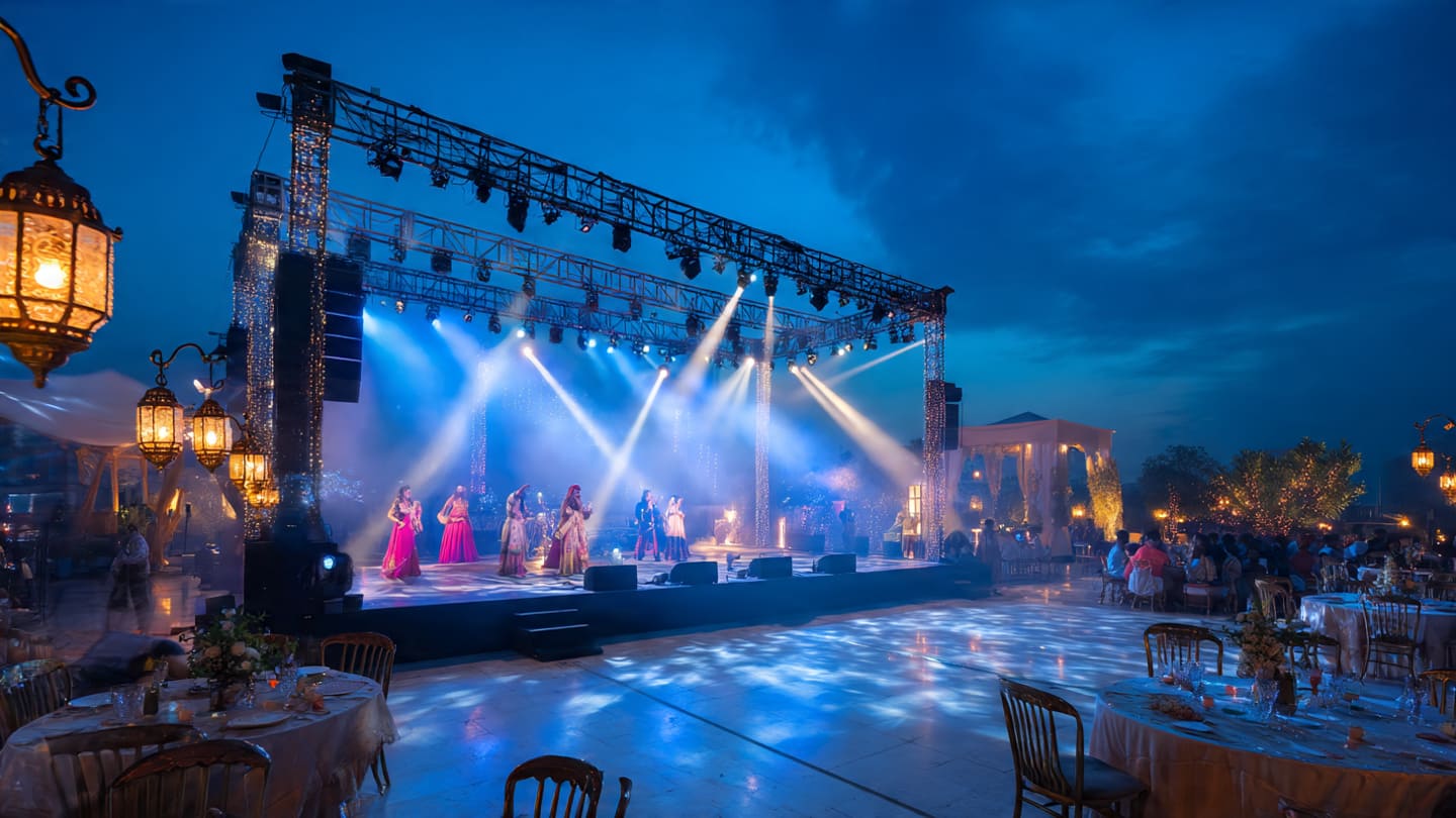 Your Sangeet shouldn't sound like a karaoke night. We use concert-grade Line Array Audio and Intelligent Lighting.